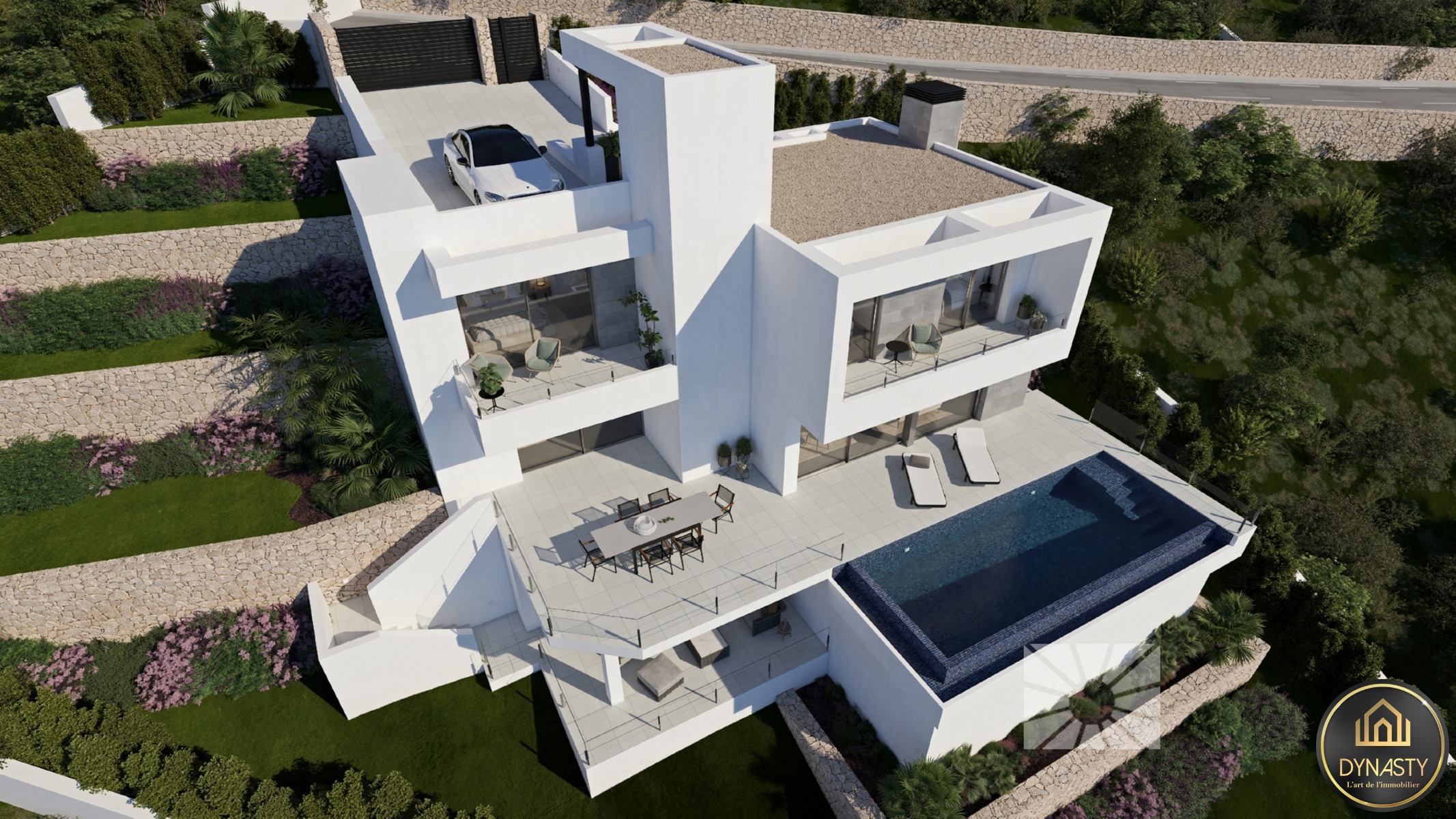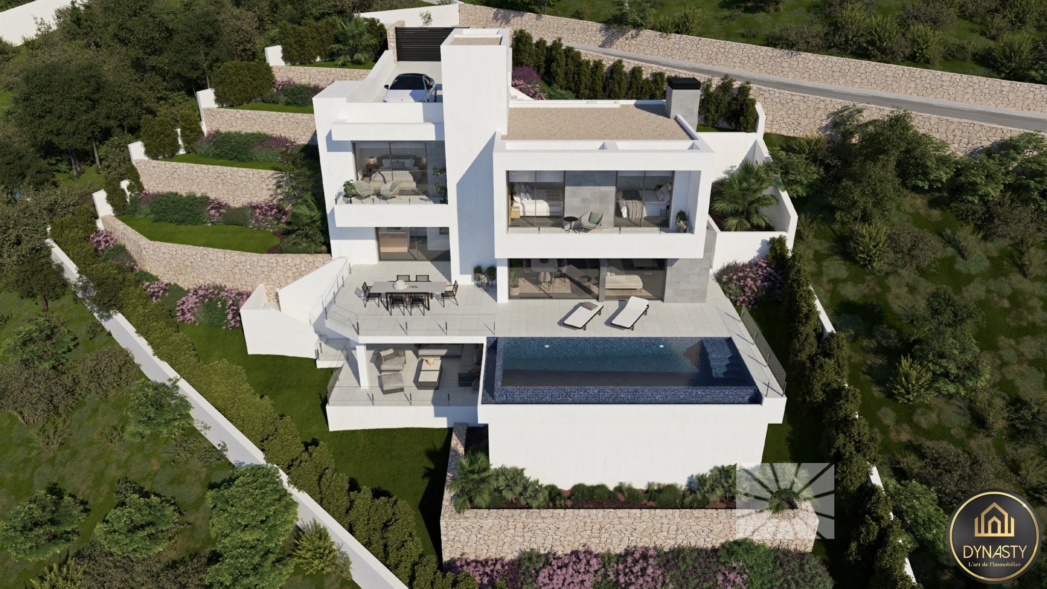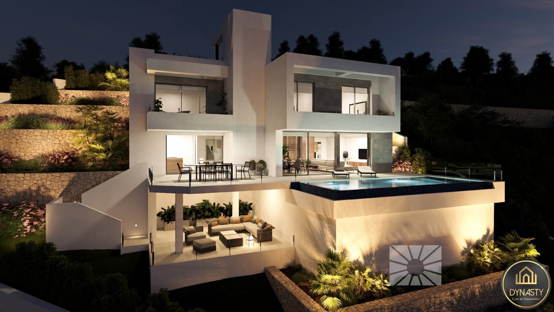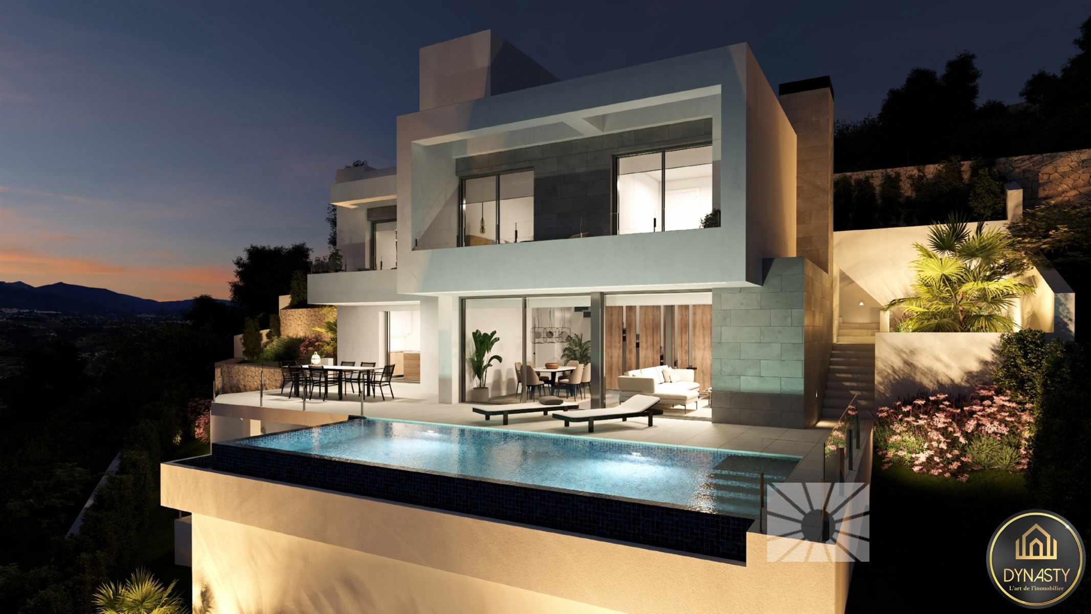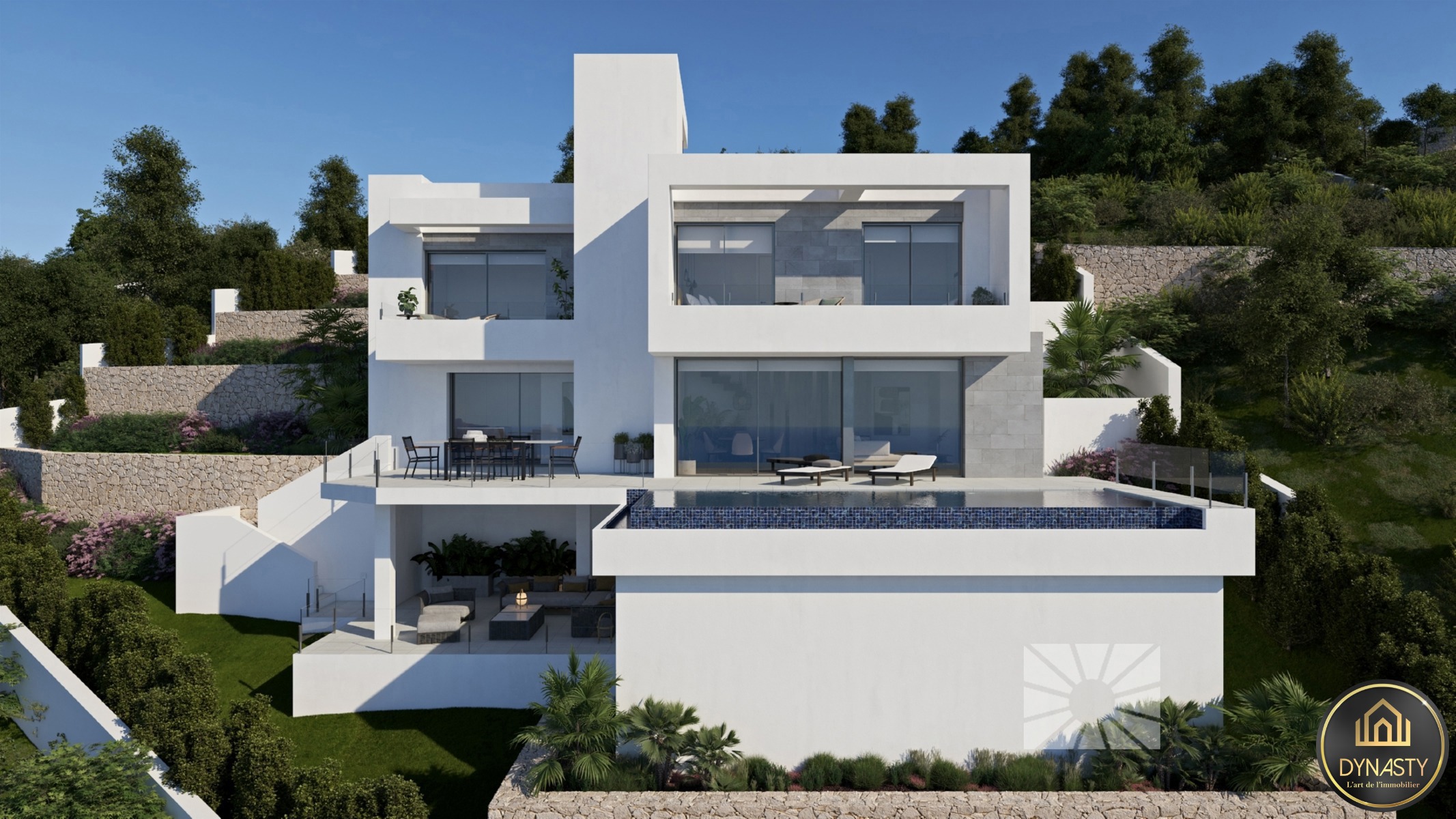 Les espaces extérieurs de cette villa de luxe ont été soignés dans leurs moindres détails, avec pour éléments caractéristiques un jardin adapté au terrain, des murets de terrassement qui créent différents espaces et niveaux, et une grande terrasse avec piscine infinity qui se fond avec la mer.